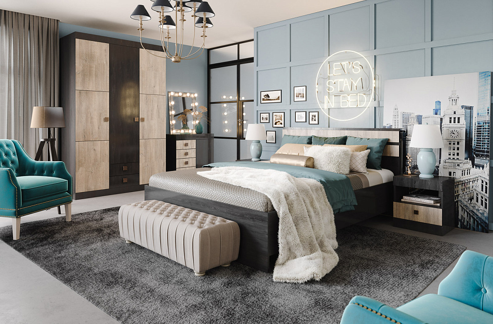 - В наборе предусмотрено наличие изделий для любых нужд, шкафы включают в себя отделы для полок из ДСП, выдвижные ящики и отделы со штангой для хранения гардероба, комоды и тумбы с выдвижными ящиками, открытыми и закрытыми отделами для полок.