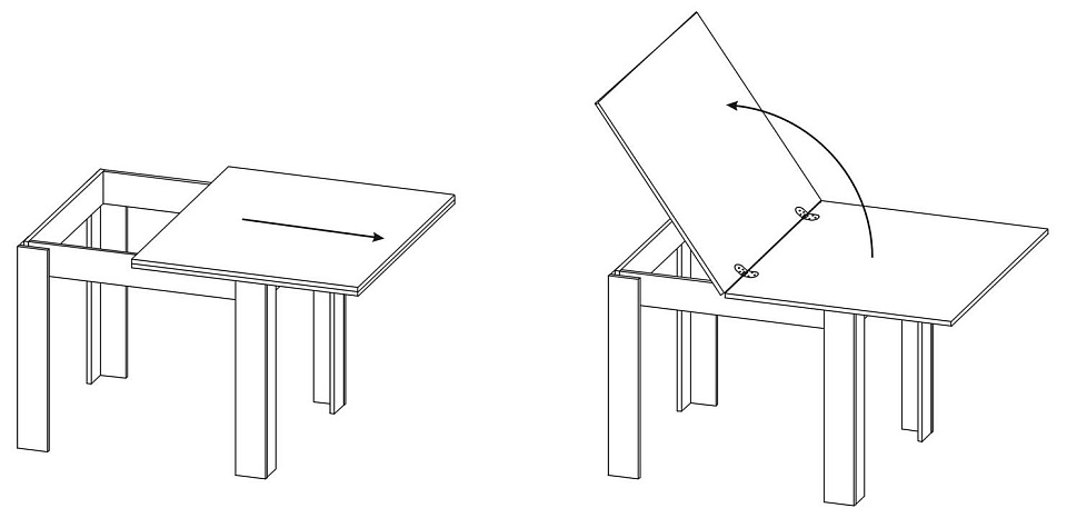 Стол оборудован раскладным механизмом, который увеличивает ширину столешницы до 1600 мм. Чтобы разложить стол, нужно отодвинуть столешницу и раскрыть ее как книжку. Легко и удобно.