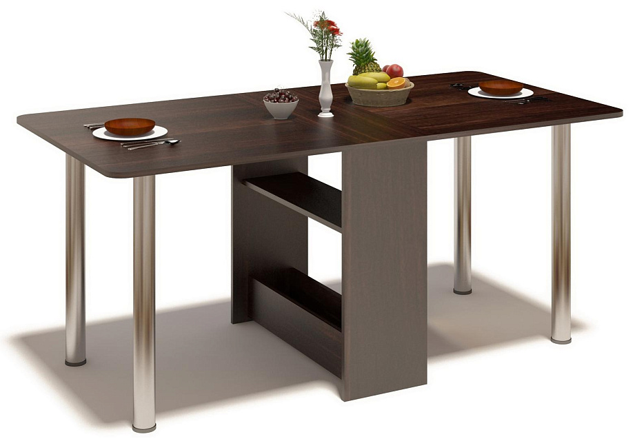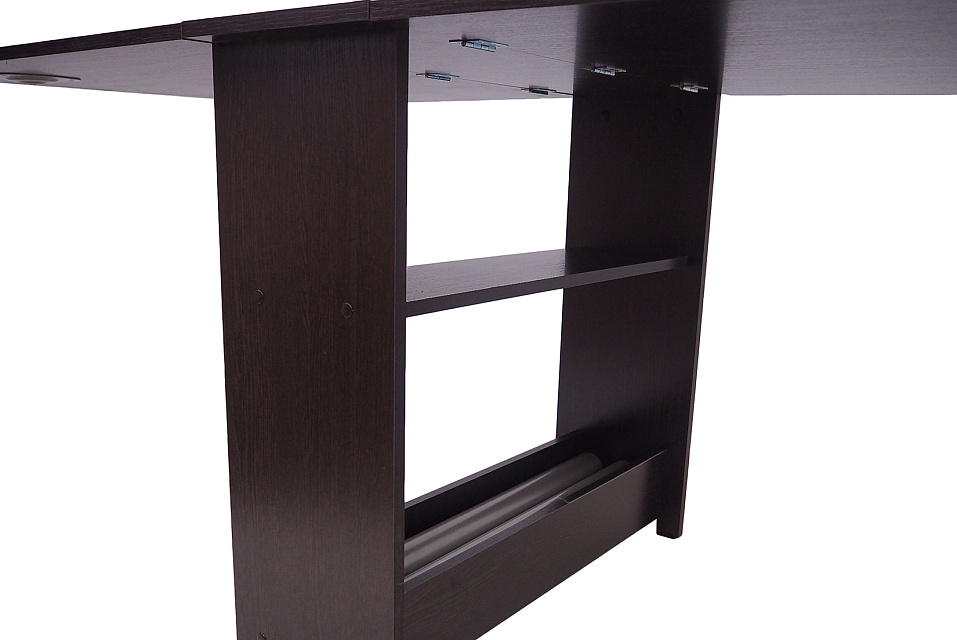 Стол-книжка на металлических опорах. Когда стол сложен, опоры хранятся внутри, в предусмотренном для этого ящике. Очень удобно, что не надо хранить их отдельно. Ширина стола в сложенном состоянии всего 295 мм, тогда как в разложенном виде — 1661 мм.