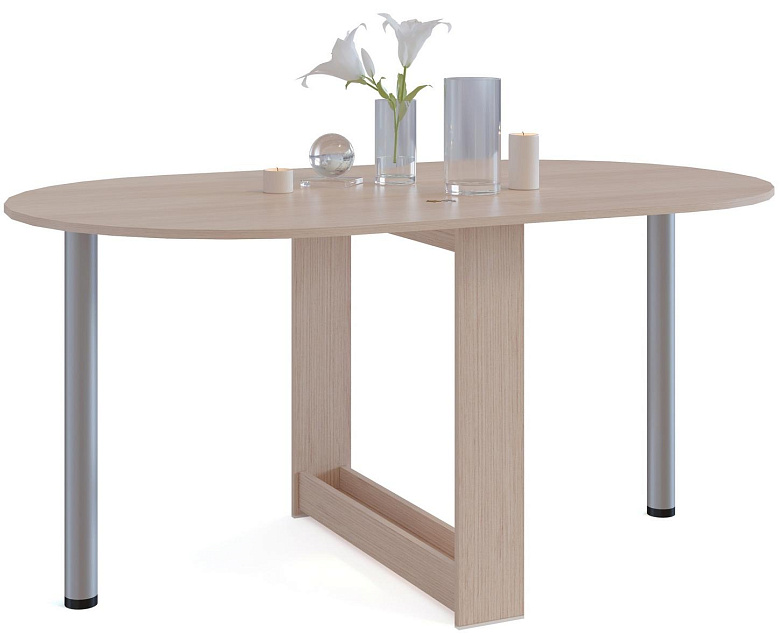 Небольшой овальный стол-книжка с откидной столешницей. Модель будет удобным элементом на небольшой кухне в квартире или в дачном домике. Отсутствие углов у столешницы снижает травмоопасность.