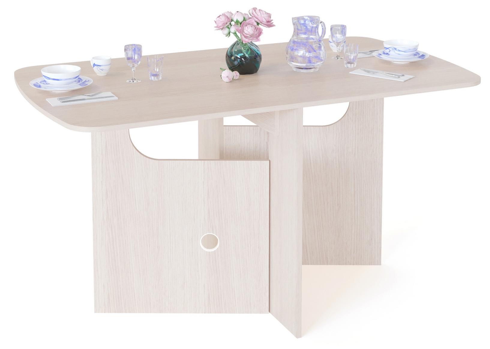 - удобный трансформер — в собранном состоянии стол удобно хранить, ведь ширина составляет всего 9 см, в разобранном виде изделие превращается в полноценный обеденный стол; скругленные углы обеспечат должный уровень безопасности, уберегут от синяков, ссадин и других повреждений;