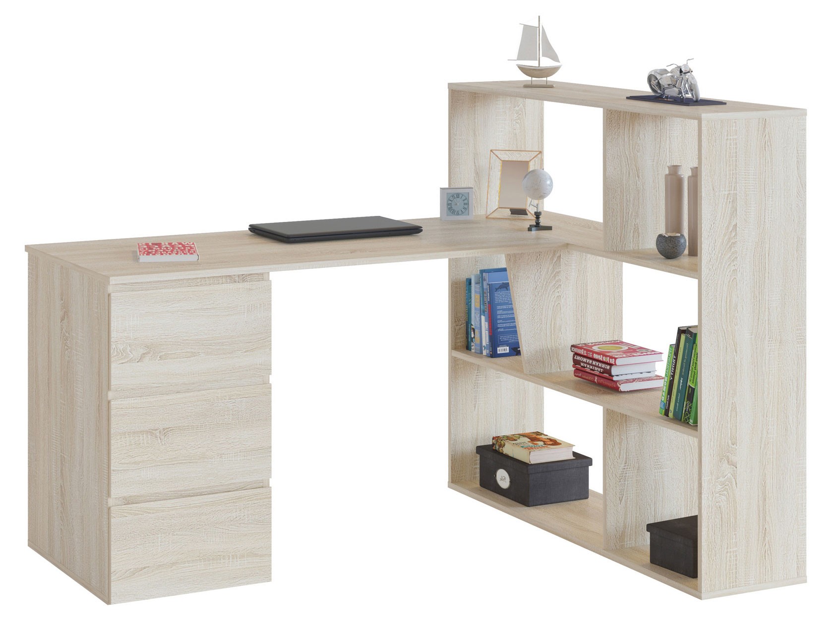- вместительность — модель оснащена стеллажом и тумбой с ящиками для удобного хранения всех необходимых для работы или учебы предметов;