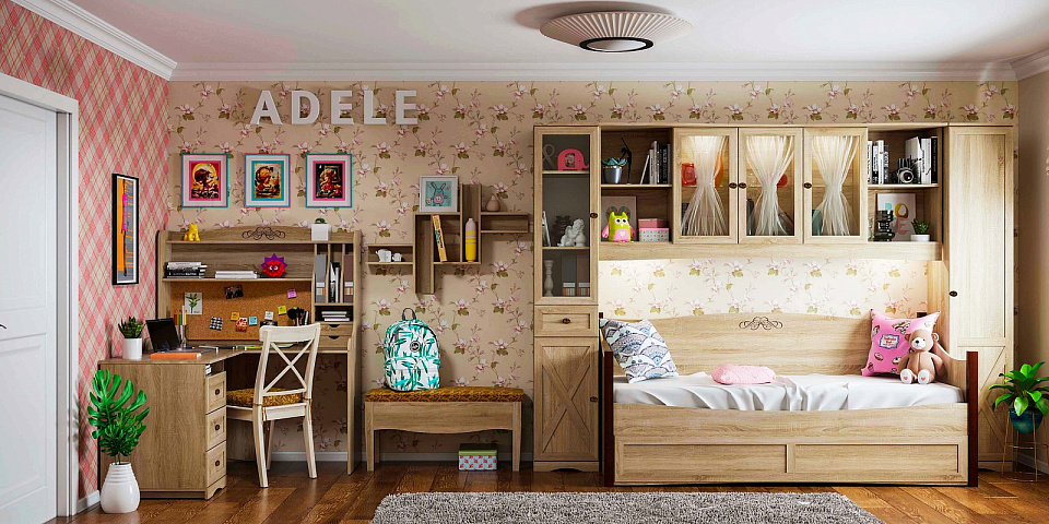Уместное предложение. В конструкции подростковой кровати Adele есть все необходимое, чтобы прослужить своей хозяйке долгие годы: удобная высота, чтобы использовать кровать днем как диван; выдвижной ящик для хранения постельного белья или организации дополнительного спального места подружке, которая останется ночевать; высокие опоры на бортиках, чтобы можно было повесить рюкзак. Ящик внизу не комплектуется ручками, чтобы девочка безопасно вставала с кровати по утрам, не царапаясь о них, открывается за специальный фигурный вырез.
