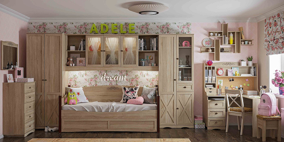 Приметы стиля. Чтобы передать дух прованса в интерьере мебель из коллекции Adele обладает ясными атмосферными признаками этого уютного французского стиля: виньетки, имитирующие резьбу по дереву, металлические ручки с цветочным рисунком, переплет из профиля МДФ на фасадах.