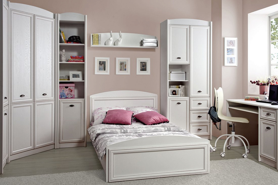 Нежный и мягкий белый цвет, оригинальные металлические ручки в виде "ракушки", закругленные верхние карнизы и патинированные фасады отражают неповторимый стиль коллекции. Созданная на основе последних тенденций в итальянском дизайне, коллекция подойдет для создания интерьера молодежной комнаты и элегантного рабочего кабинета. Набор мебели Salerno - это особенное настроение в вашем доме.