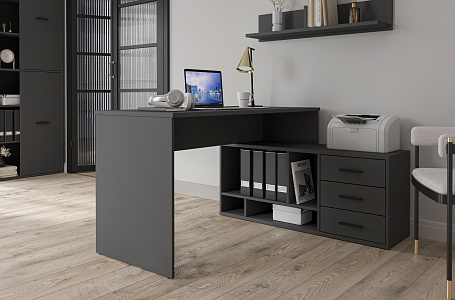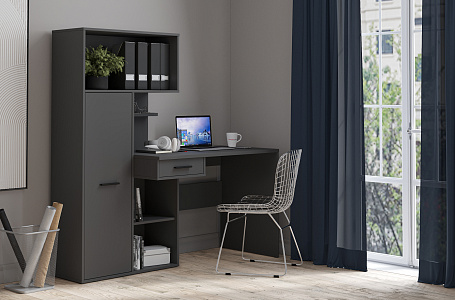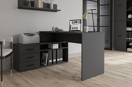 - Модульность: Коллекция построена на модульном принципе, что позволяет комбинировать элементы в соответствии с потребностями и размерами помещения. Модули включают в себя шкафы с закрытыми секциями, открытые полки и угловые столы.