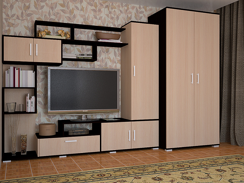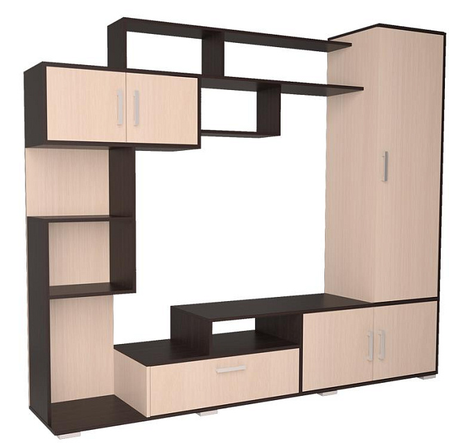 Наиболее открытый представитель серии. Успешно решает задачи эстетичности внешнего вида и практичности в хранении. Стенку можно докомплектовать платяным шкафом для дополнительного пространства.