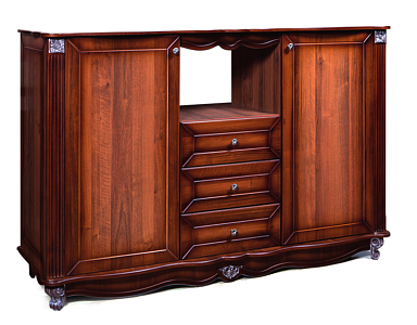 В наборе мебели присутствуют два вида витрин различных по размеру, два вида комода с открытыми и закрытыми фасадами, шкаф двух-дверный и тумба под ТВ, все эти изделия позволяют скомплектовать любой набор, который будет подходить по размеру и интерьеру любой комнаты.