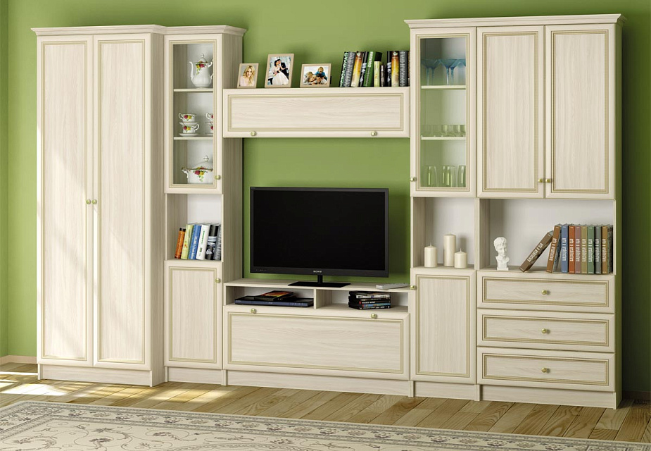 Гостиная «Брайтон» выполнена в светлом декоре «Ясень Асахи», в лучших классических традициях. Модульная серия «Брайтон» укомплектована фасадами с накладным профилем с декоративным орнаментом. Открытые остекленные фасады дают возможность расставить на полках посуду, сувениры и разные мелочи. Большое количество полок и отделений делает гостиную удобной и функциональной. В выдвижных ящиках используются роликовые направляющие.