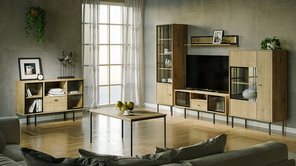 Гостиная «Бруклин» идеально впишется в индустриальный интерьер. Легкая конструкция всех элементов и красивый оттенок дуба, дополненный контрастным металлическим профилем, станут универсальным решением для обстановки.