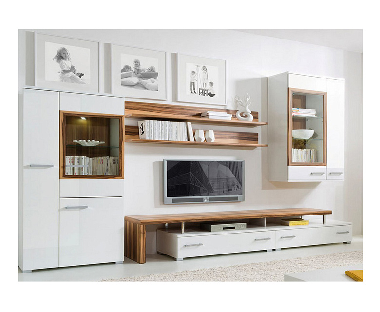 Особенностью данного набора мебели является интересное сочетание текстур и материалов. Роскошная комбинация древесной текстуры (орех балтимор) и блеска (белый блеск) создает ощущение оригинальности и свежести. Оригинальным является конструкторское решение некоторых элементов набора (полка S144-PAN/14/12, тумба S144-RTV2S/4/23). Стеклянные витрины обрамленные планкой цвета «орех балтимор» в сочетание с подсветкой придают набору изысканность и неповторимость. Функциональный дизайн и широкий модульный ряд предоставит Вам множество вариантов оформления гостиной. Стильный дизайн, четкость и лаконичность линий, гармоничное сочетание светлых и темных текстур – основные характеристики присущие набору модульной мебели Доломит.