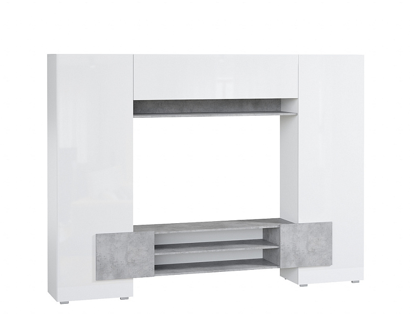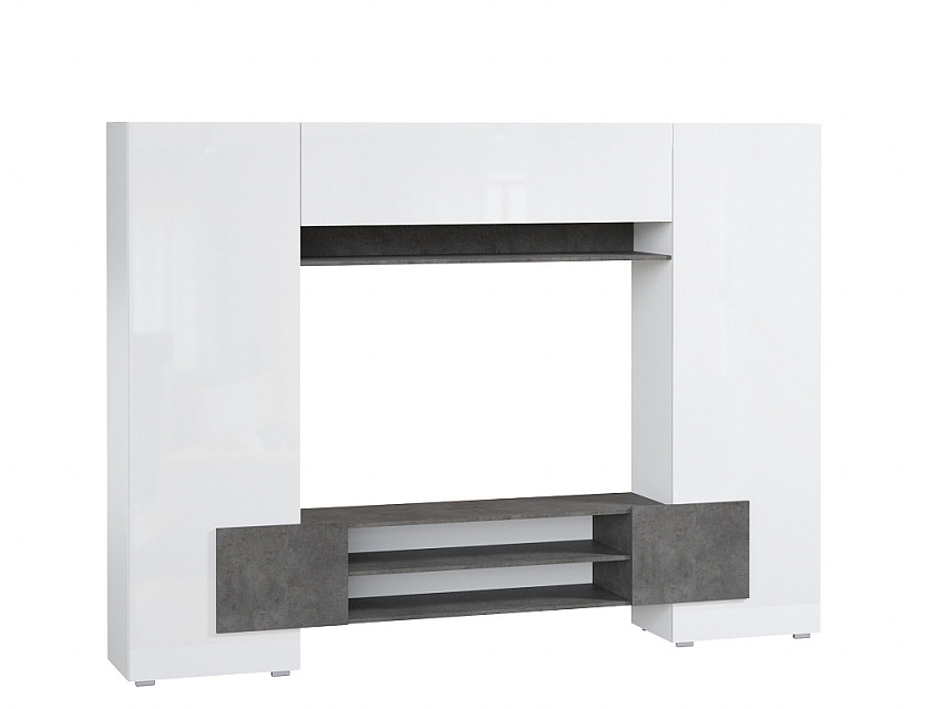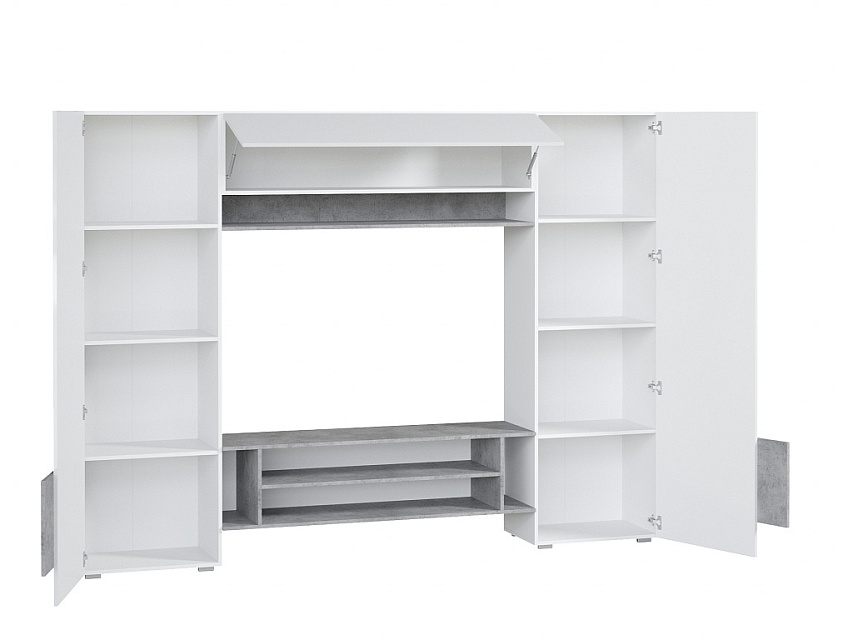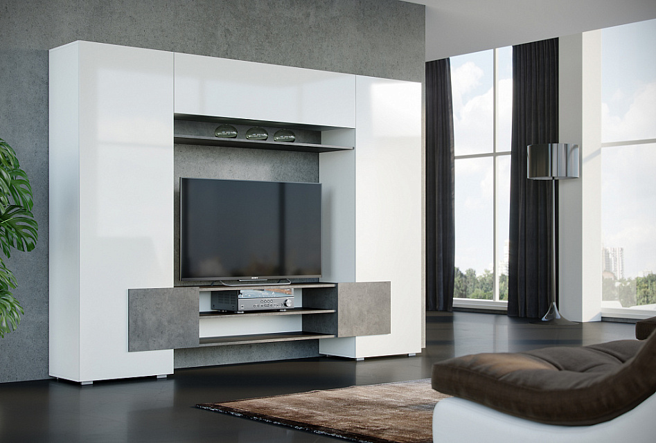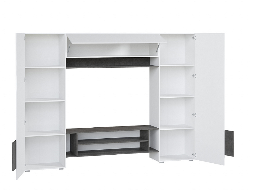 Стенка «Элиста» – это актуальное цветовое решение и неординарная конструкция. Белый корпус и фасады, серые элементы с фактурой бетона дополняют и подчеркивают современный, футуристичный облик модели. Такое сочетание впишется в любой современный интерьер: скандинавский, минималистичный и даже индустриальный.