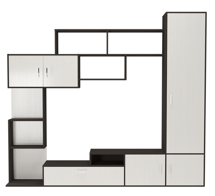 Компактная стенка с асимметричным расположением шкафов. Прекрасно подойдет для рабочих кабинетов, зала или гостиной .
