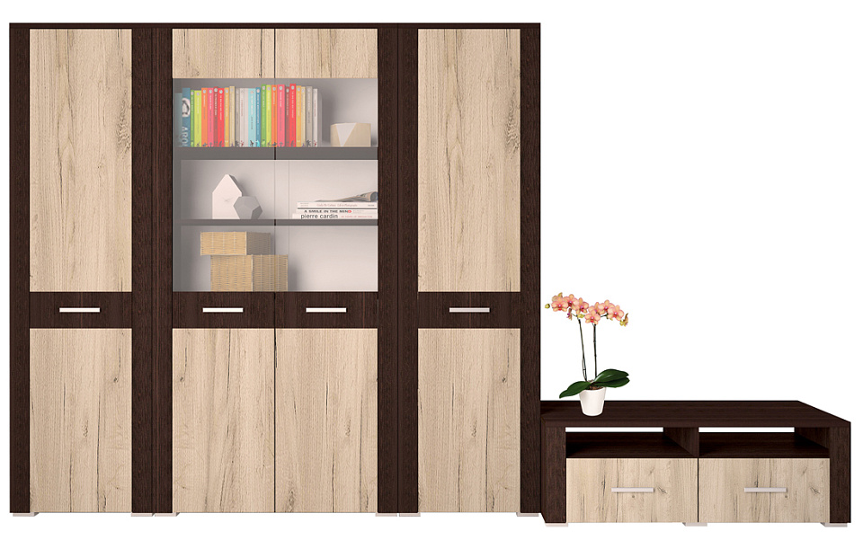 Набор Коламбия-2 - это простое решение Вашей гостиной. Вариант обладает богатой древоподобностью и уникальной фактурой. А декоративные панели, объемные плиты, комбинированные в контрасте дверей и свежей фурнитуры, выделяют коллекцию Коламбия.