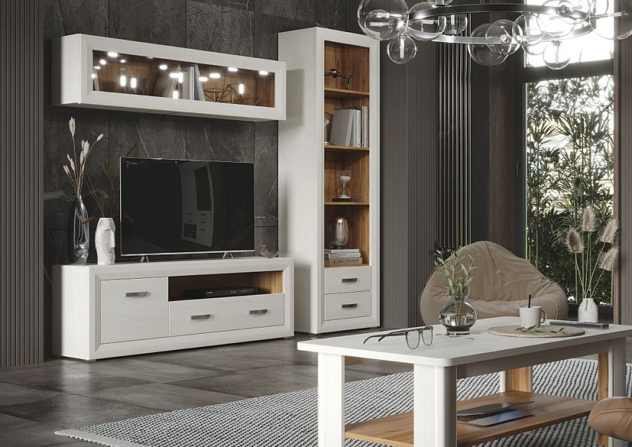 Великолепные белоснежные фасады коллекции удачно контрастируют со вставками из «ореха лион», продолговатые металлические ручки добавляют изящества, а подсветка стеклянных полок выгодно подчеркивает древесную структуру.