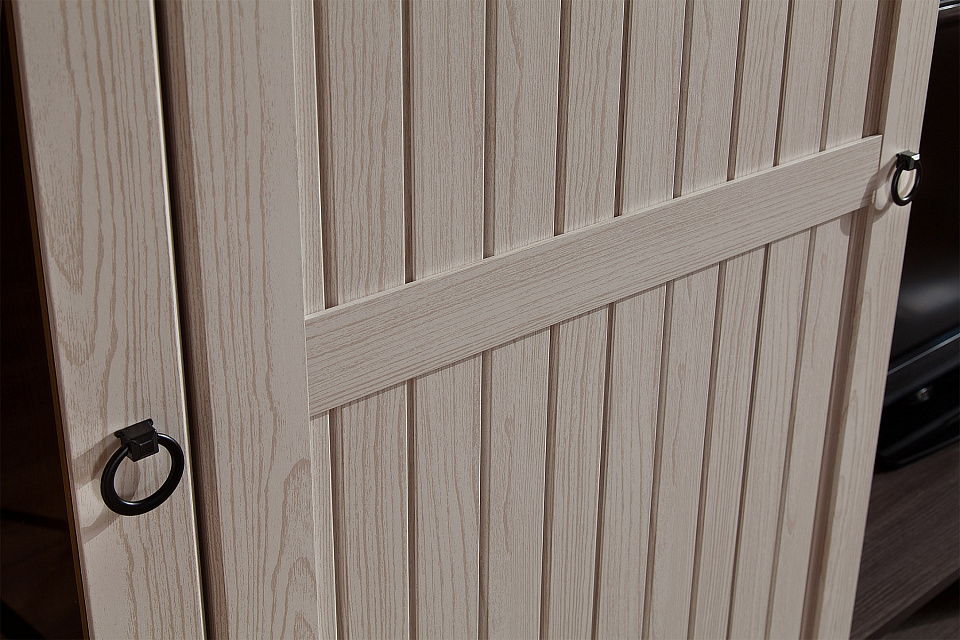 Белые рамочные фасады мебели для гостиной, будто собранные из небрежно окрашенных состаренных деревянных досок, выполнены из профиля МДФ. Наружные задние стенки в нишах также оформлены белым профилем, имитирующим наборный деревянный фасад. Х-образная раскладка на фасадах и металлические ручки-кольца – узнаваемые черты кантри-стиля.
