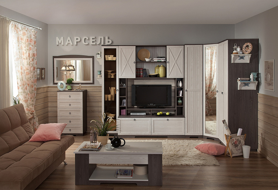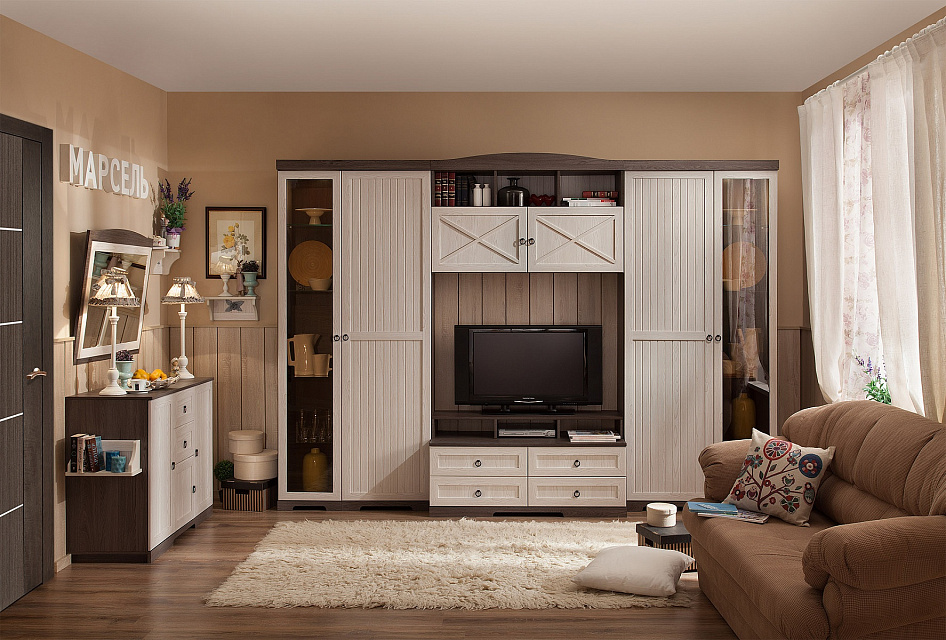 Коллекция для гостиной Марсель в стиле прованс понравится тем, кто предпочитает уют деревенского стиля современным минималистичным интерьерам.