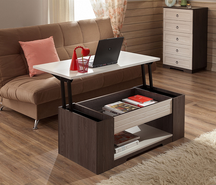 Раскладной 219 Стол-трансформер превращает журнальный столик - в рабочий письменный стол. Просторные ниши под столешницей позволяют хранить все нужные бумаги под рукой.