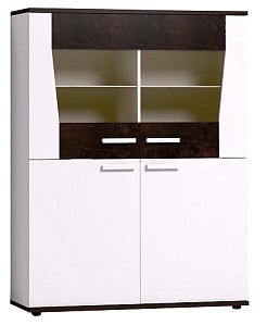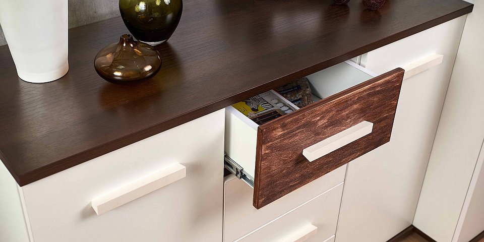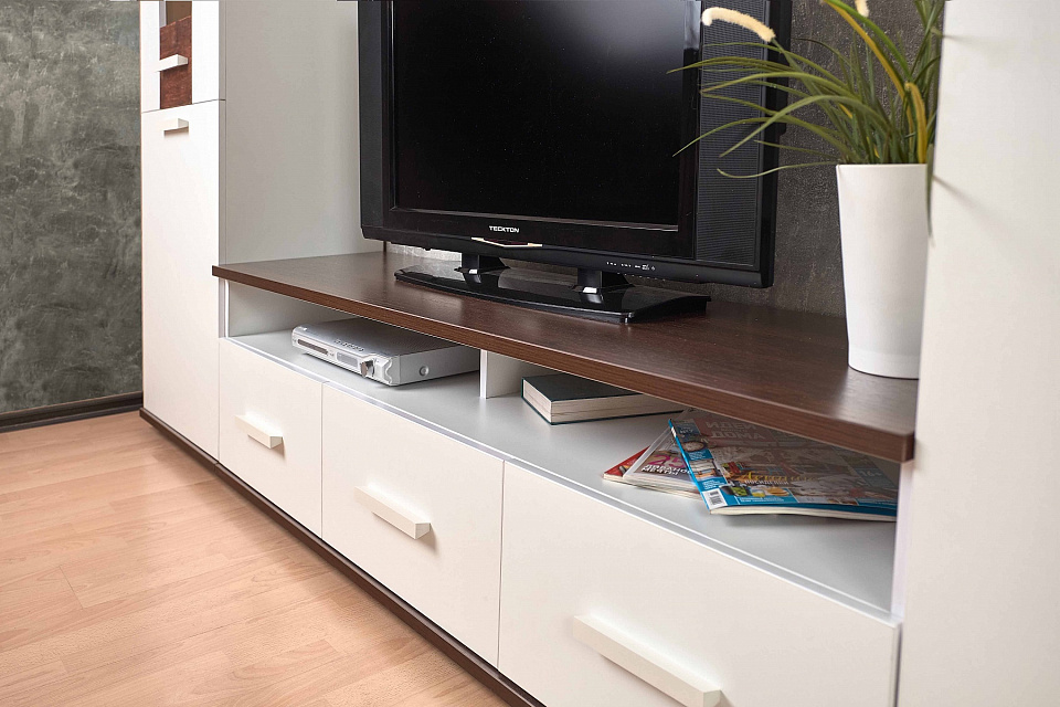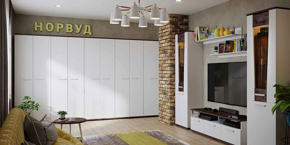 Основной декор гостиной НОРВУД — белый. Именно он отвечает за визуальное расширение пространства и освещения. Контрастные горизонтальные поверхности толщиной 22 мм в декоре Орех Шоколадный разбавляют белые фасады модулей.