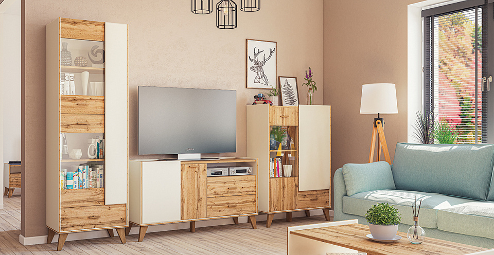 Коллекция "Сканди" изготовлена из комбинации высококачественных ламинированных плит белого цвета и цвета дуба вотан с деревянными ножками и ручками. Стандарт включает в себя высококачественные шариковые направляющие полного выдвижения и систему бесшумного закрытия дверей (петли с демпфером).