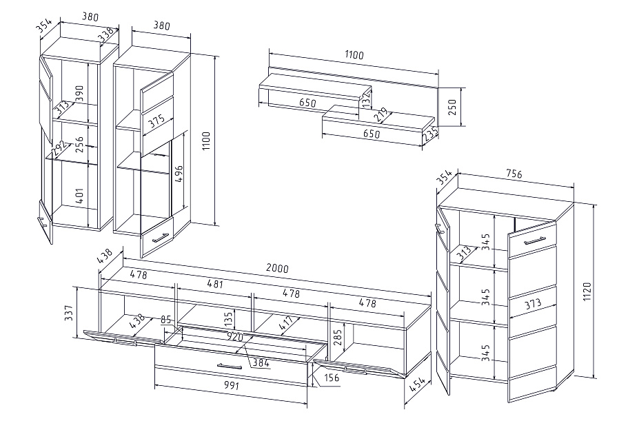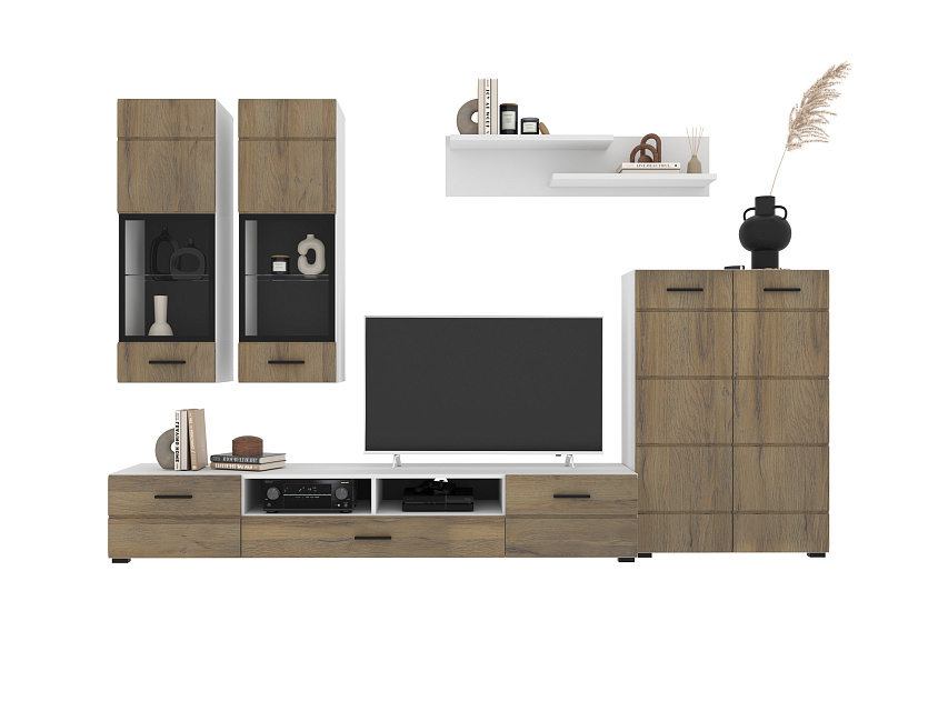 В комплект входят 5 модулей: тумба ТВ, напольный шкаф, полка, 2 навесных шкафа со стеклом.
