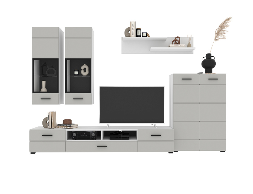 В комплект входят 5 модулей: тумба ТВ, напольный шкаф, полка, 2 навесных шкафа со стеклом.