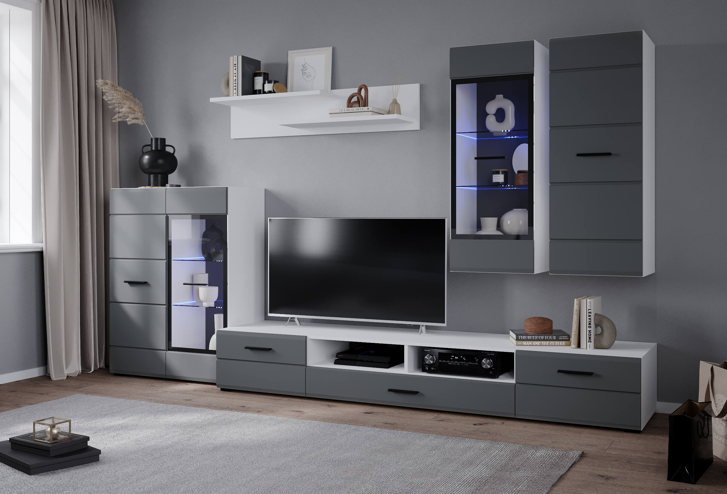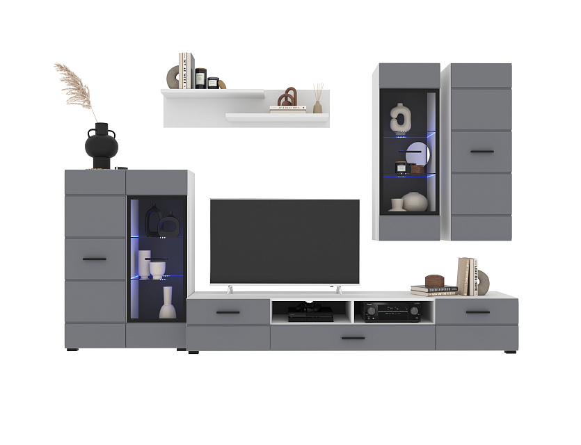 В комплект входят 5 модулей: тумба ТВ, напольный шкаф комбинированный со стеклом (укомплектован подсветкой), полка, навесной шкаф со стеклом (укомплектован подсветкой), навесной шкаф.