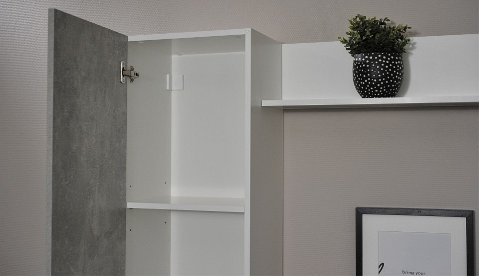 Мини-стенка «Нео» — современное, функциональное решение для гостиной, поможет рационально обустроить комфортную зону для отдыха и просмотра TV. Большая ниша для телевизора, закрытые шкафчики и открытые полки вместят в себя всё самое необходимое. Корпус выполнен в цвете белый жемчуг, который подчеркивает простые и легкие геометрические формы стенки. Фасады в новом модном цвете ателье светлый матовые-практичны и создают уют.
