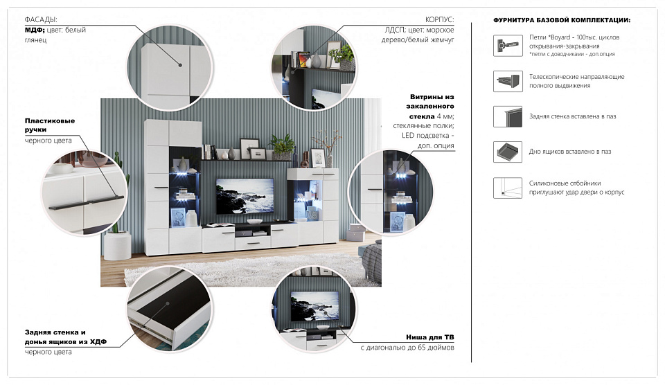 Современная стенка Невада – яркий представитель стиля минимализма, отличается высокой функциональностью и эстетичным внешним видом. Глянцевые белые фасады из МДФ и прозрачные витрины из закаленного стекла создают легкость и воздушность, а эффект блеска и отражения зрительно увеличивает пространство комнаты, добавляет света. Комбинированный контрастный корпус, ручки и задняя стенка черного цвета подчеркивают строгую геометрию линий и форм. Светодиодная подсветка делает акцент на дорогих для Вас вещах, таких как фото, статуэтки или посуда. Мебель выполнена из экологически безопасных и надежных материалов.