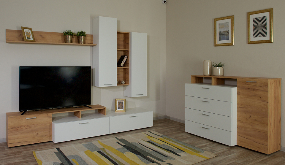 Горка Невио-1 выполнена с учетом новейших дизайнерских решений – сочетание теплого оттенка дерева с четкой древесной текстурой и белого цвета, разноуровневые модули, углубленный цоколь, скрытая крепежная фурнитура. Все эти элементы создают визуальную легкость и компактность горки. Мебель легко устанавливается и регулируется по высоте. Широкая тумба для ТВ позволит разместить телевизор любой диагонали, полки послужат для размещения других медиа устройств.
