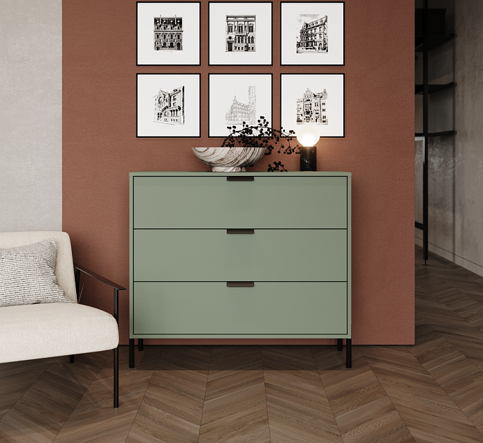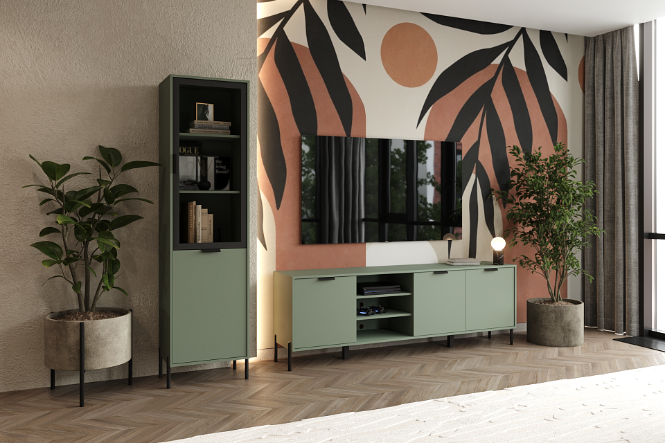 Вдохновленная северными просторами, коллекция мебели для гостиной в скандинавском стиле приносит в ваш дом свежесть утреннего тумана и мягкость солнечного света. Фасады и корпус, окрашенные в изысканный дымчатый зеленый цвет, отражают спокойствие природы, а декоративная черная планка создает выразительный контраст, привлекая взгляд.