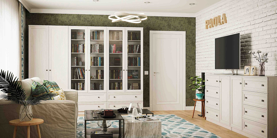 Стеклянные фасады коллекции PAOLA, обрамленные сложным профилем МДФ, и светлая цветовая гамма хорошо сочетается с любой современной мебелью и легко впишется в обстановку.