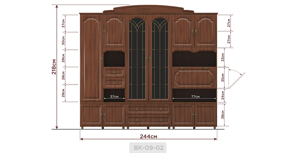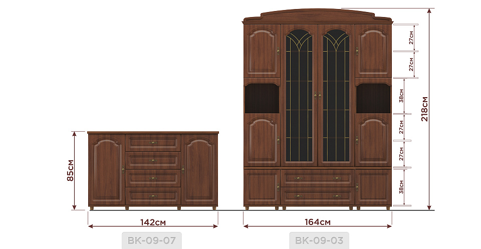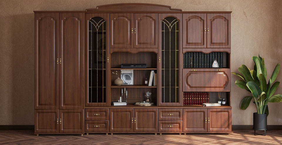 Гостиная выполнена в классическом стиле, которые из года в год остаются на пике мебельной моды и активности. Выглядят единой композицией, которая состоит из шкафов, витрин, комодов, полок, стеллажей.