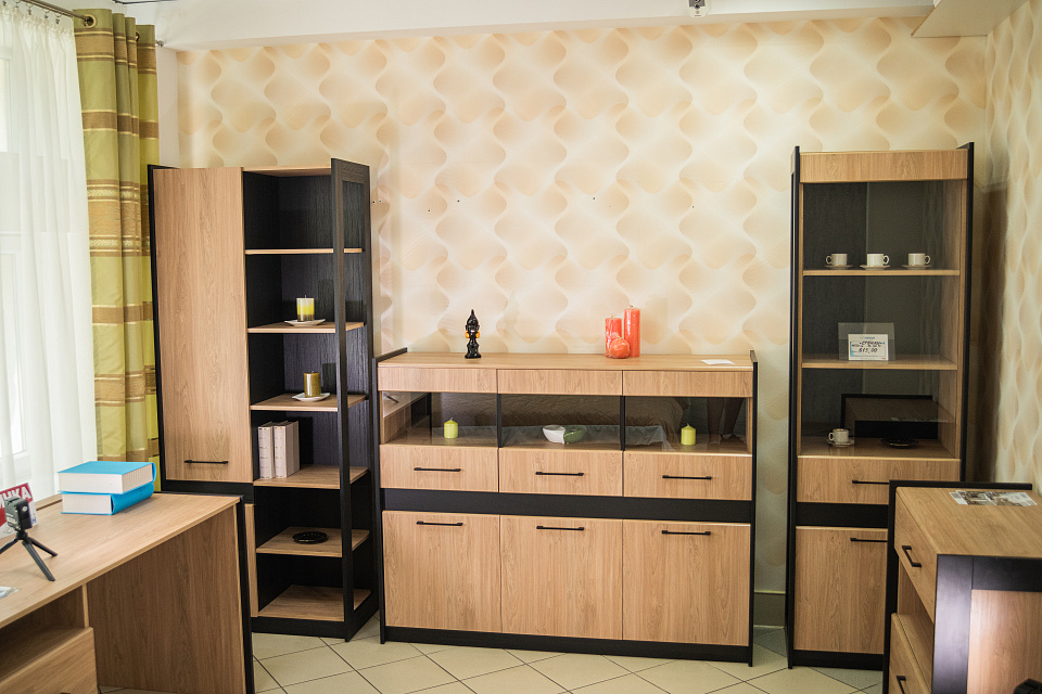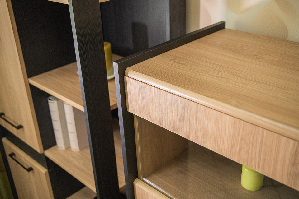 Особое внимание заслуживает эксклюзивный модуль‑стеллаж с открытыми полками. Несмотря на внушительные габариты, он создаёт ощущение лёгкости и воздушности, позволяя разместить книги, предметы декора и аксессуары, которые подчеркнут индивидуальность вашего интерьера.