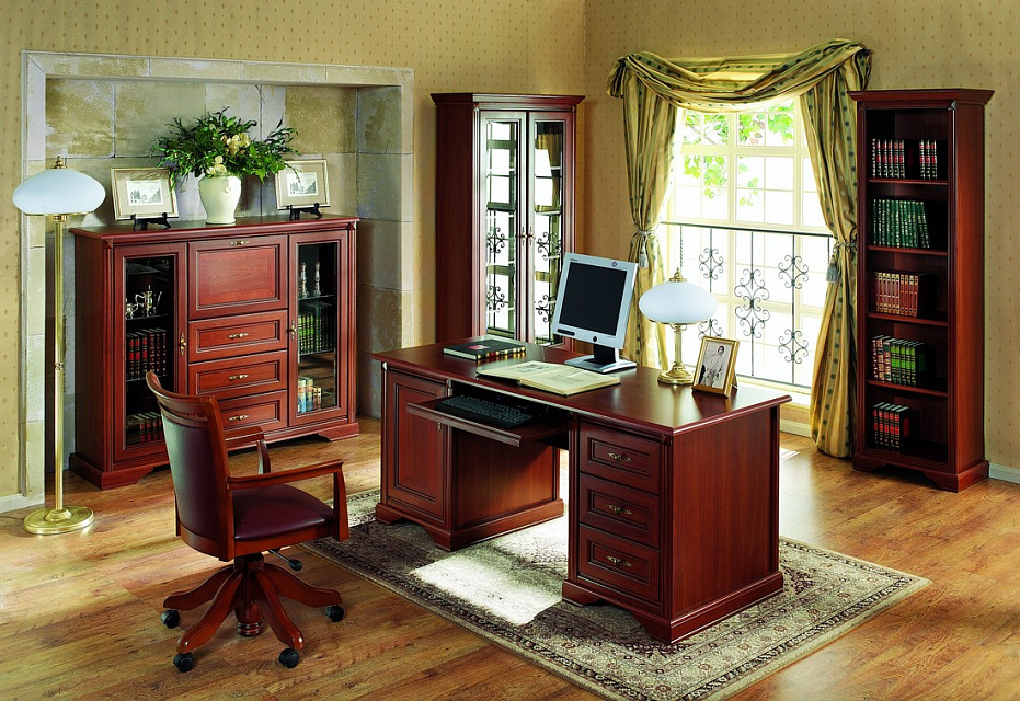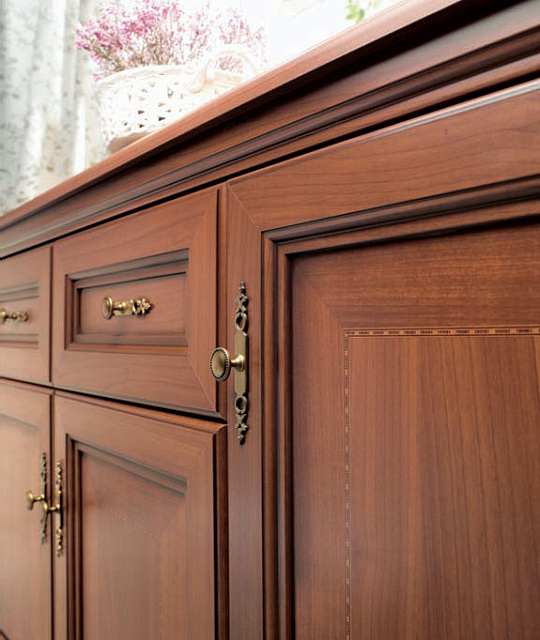 Коллекция в традиционно классическом стиле. Патинирование и узор интарсии, выполненный техникой трафаретной печати, богато украшенные резьбой фасады, цоколи, карнизы и пилястры - отличительные характеристики коллекции.