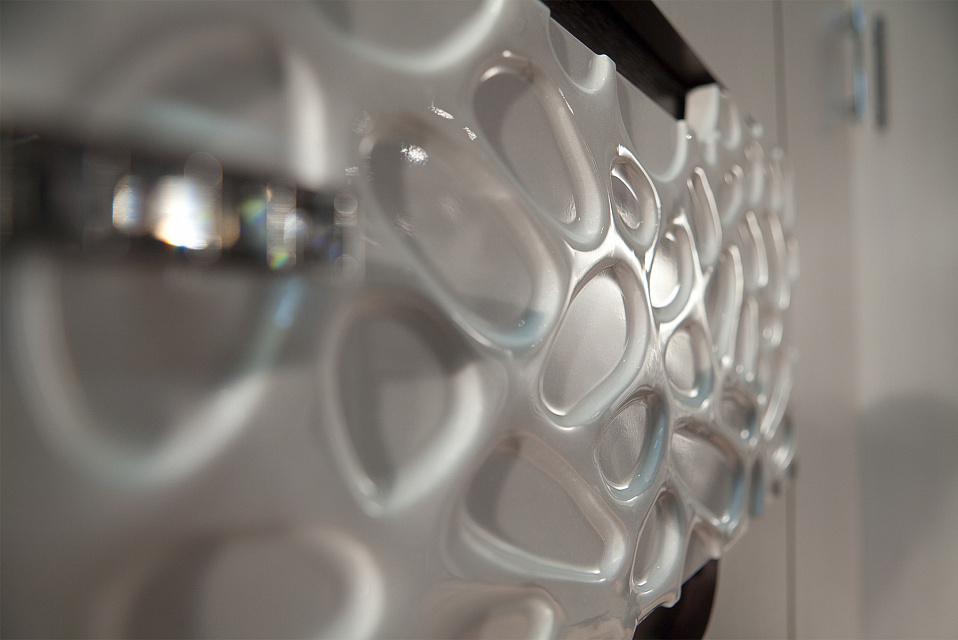 К глянцевым фасадам с рельефом "волшебных пузырьков" так и хочется прикоснуться! Такие мебельные МДФ фасады просты в уходе и смогут задать интерьеру определенным ритм: поддержите форму овалов другими элементами декора - вазой, рисунком на шторах или ковре.