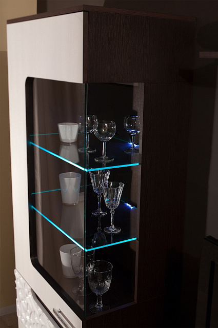 Стеклянные витрины шкафов для посуды с еврокромкой увеличивают количество света в гостиной и обзор содержимого: красиво снаружи и аккуратно внутри. Дверцы со стеклом плотно закрываются благодаря магнитным защелкам.