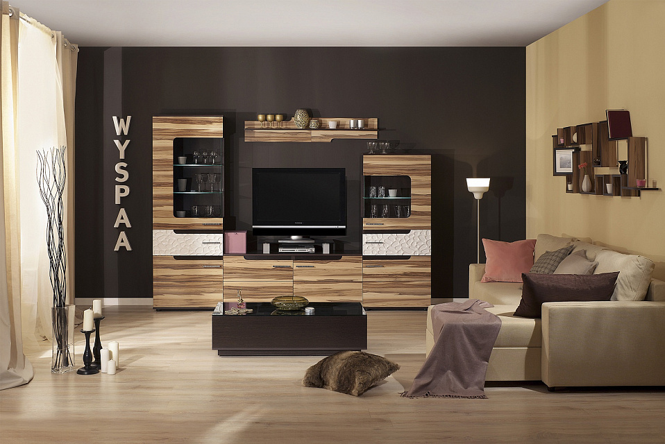 Яркий динамичный декор Орех Балтимор в мебельной коллекции Wyspaa поддерживает современные тенденции в декоре интерьера. Грубоватые фасады "под дерево" сочетаются модным белым глянцем.
