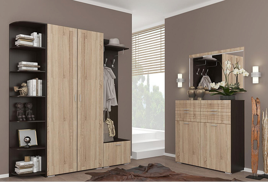 Современная прихожая с дизайном, который впишется в любой интерьер. Шкафы, несмотря на небольшую глубину, вместительны. В серии используется ручка 96 мм сатин светлый пластмасса. В шкафах появилась створка с разделенными зеркалами.
