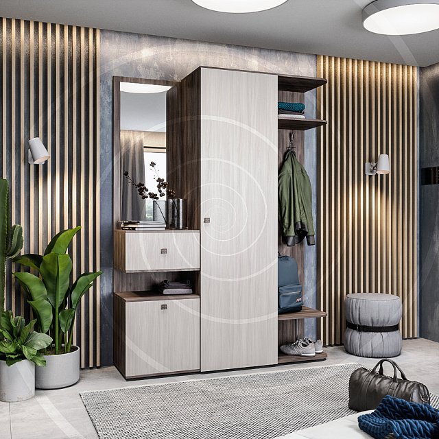 Наполнение шкафа включает слева два отделения. Средняя секция оборудована выдвижным ящиком, нижняя – полкой для обуви за откидной дверью. Зеркало также входит в комплект. Справа в нишу вмонтированы крючки, а в средней части размещены две стационарные полки и выдвижная штанга. Шкаф установлен на нерегулируемые опоры с тонкой прослойкой воздуха для облегчения общего вида.