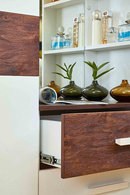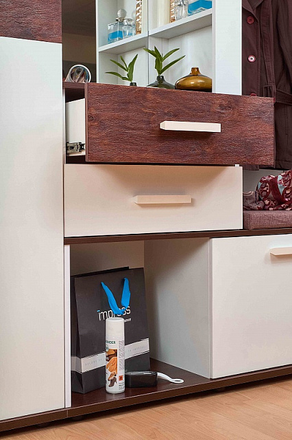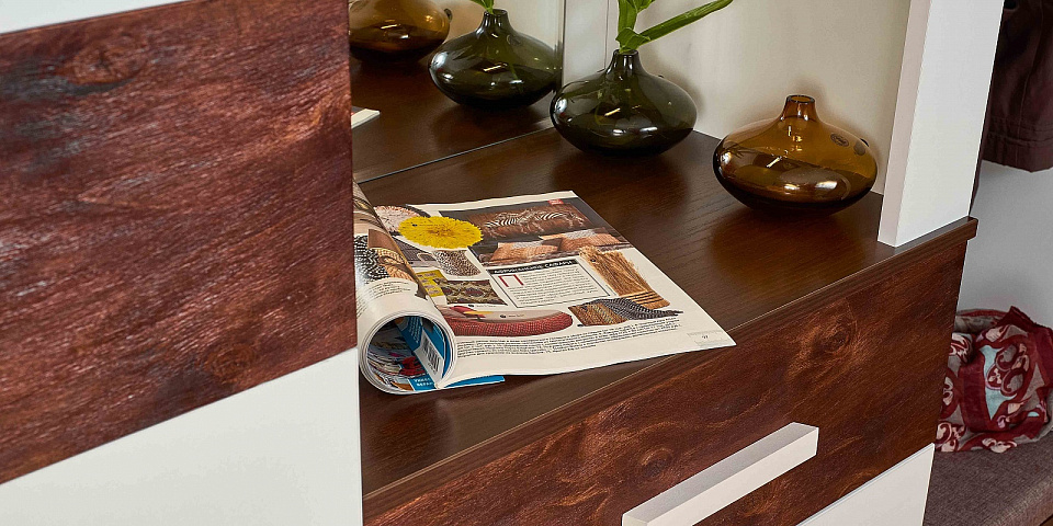 В прихожей Норвуд Белый декор используется в качестве основного цвета. При этом помещение не будет выглядеть просто, так как в дизайне модулей Норвуд используются контрастные горизонтальные поверхности и брашированные деревянные вставки в декоре Орех Шоколадный. Выразительное сочетание актуальных декоров не останется незамеченным и привнесет теплоту в атмосферу вашего дома.Деревянные брашированные вставки в декоре Орех Шоколадный покрыты лаком, который подчеркивает рельефную структуру поверхности.