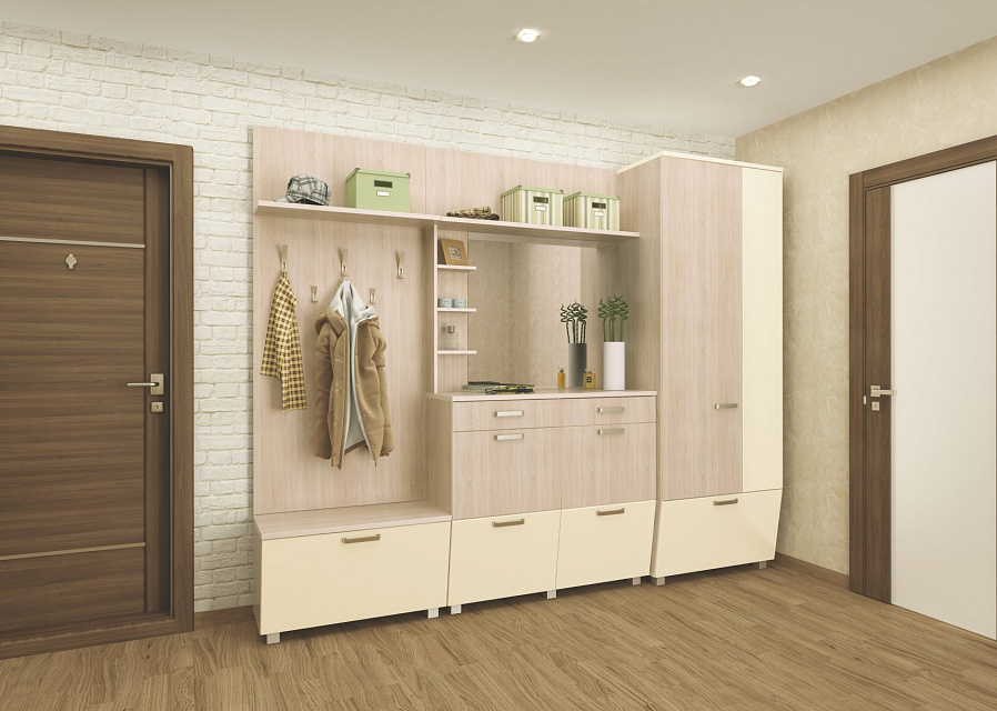 Светлая древесная текстура и глянцевый стеклянный декор, элегантная простота конструкции, вместительность и большой выбор модулей — явные преимущества прихожей «Оливия».