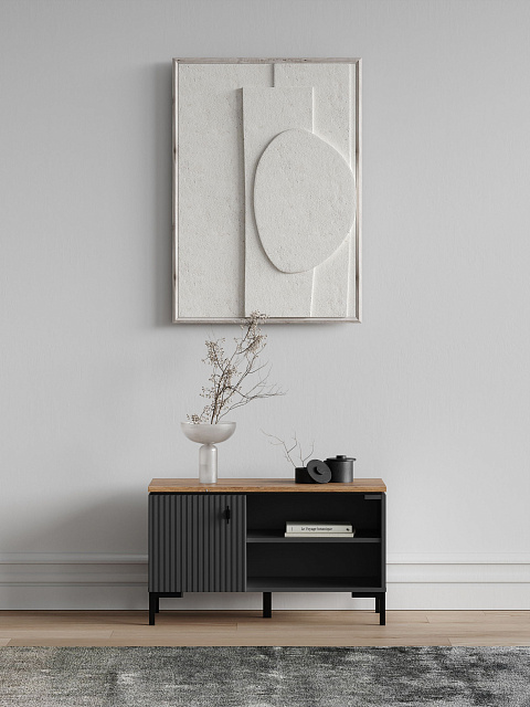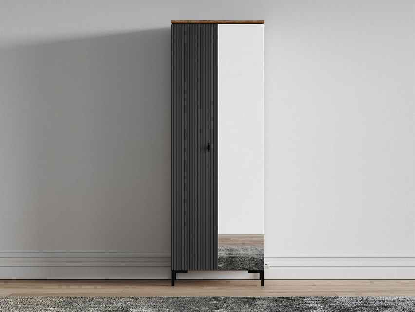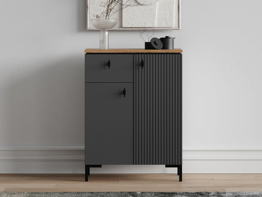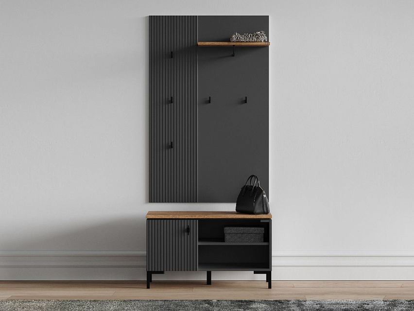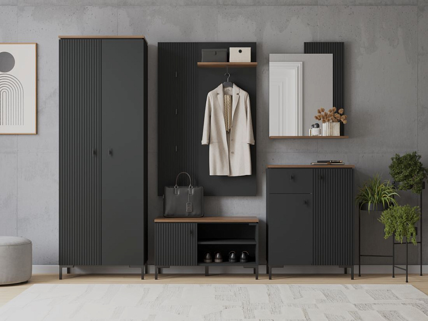 Темные гладкие и рифленые фасады, стильные высокие ножки, черные матовые ручки, акцентная столешница - отличительные особенности набора.