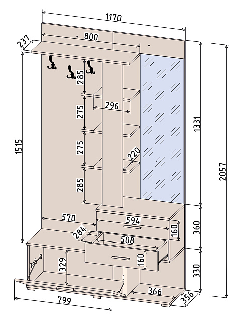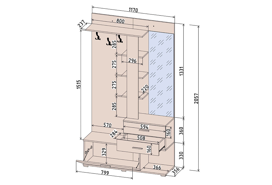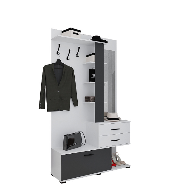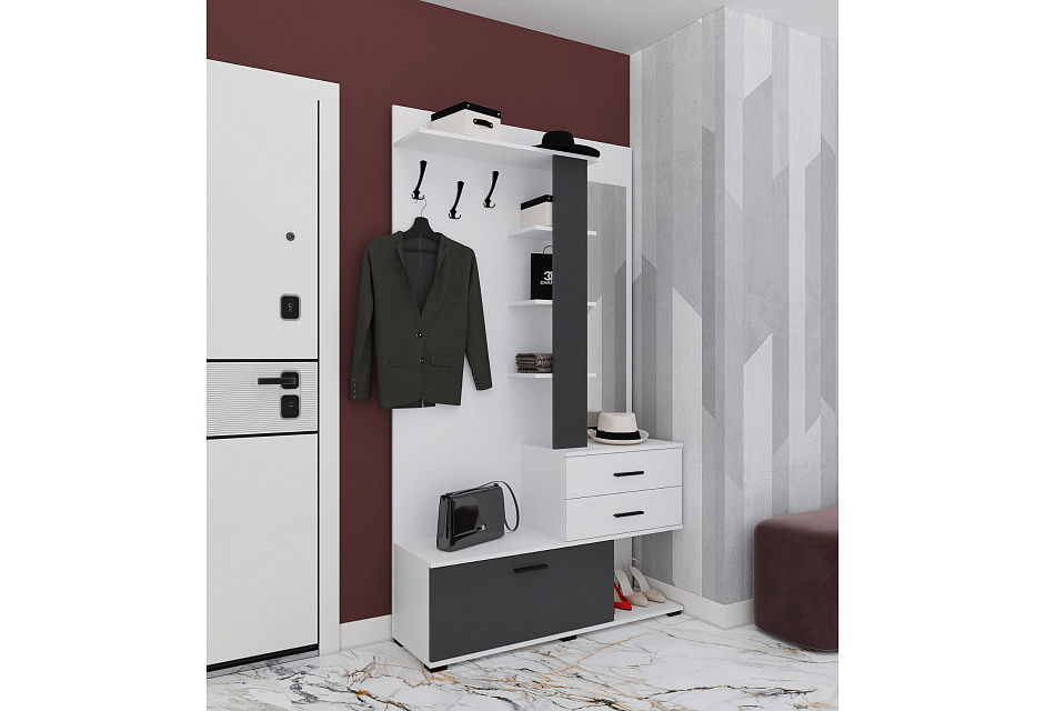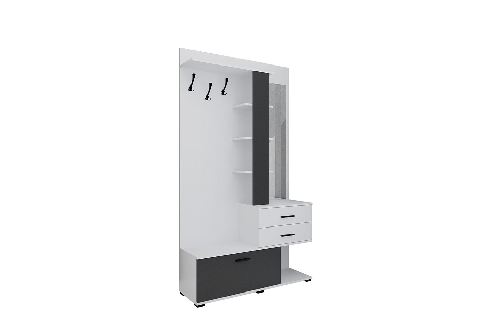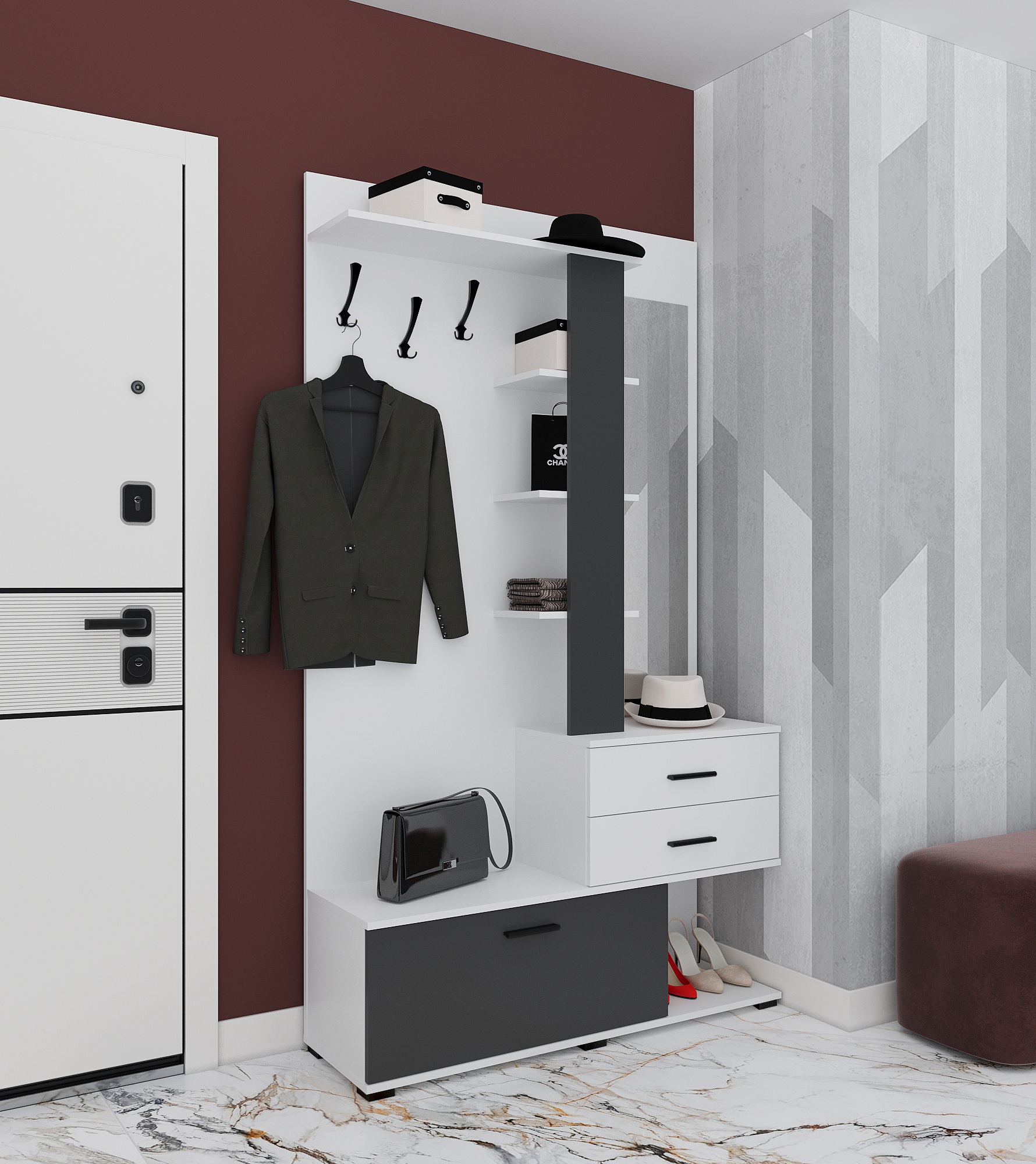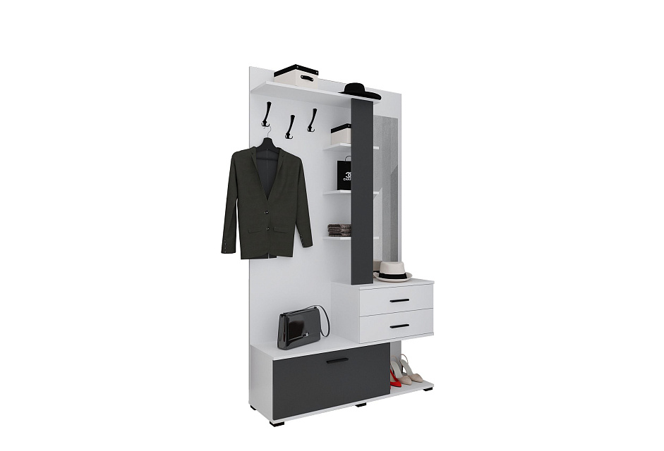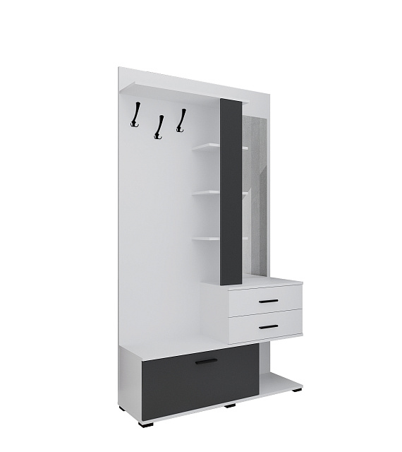 Компактная прихожая с двумя шуфлядами полного выдвижения, зеркалом, тумбой для хранения обуви, открытой антресолью и зоной с крючками для одежды.