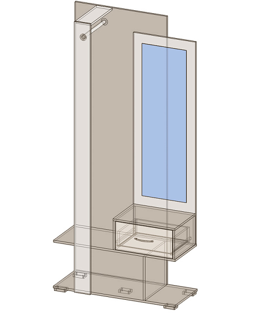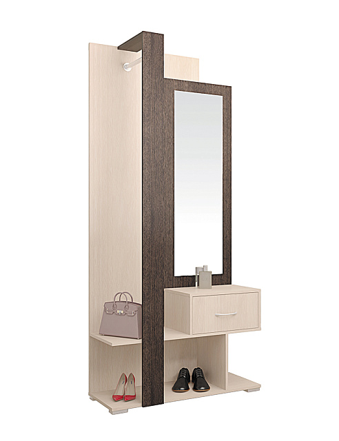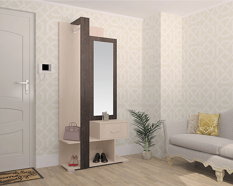 Самая компактная прихожая, способная выполнить свои функции, занимая минимум площади. Имеет шуфляду полного выдвижения, зеркало, трубу для вешалок и открытые ниши для хранения вещей.
