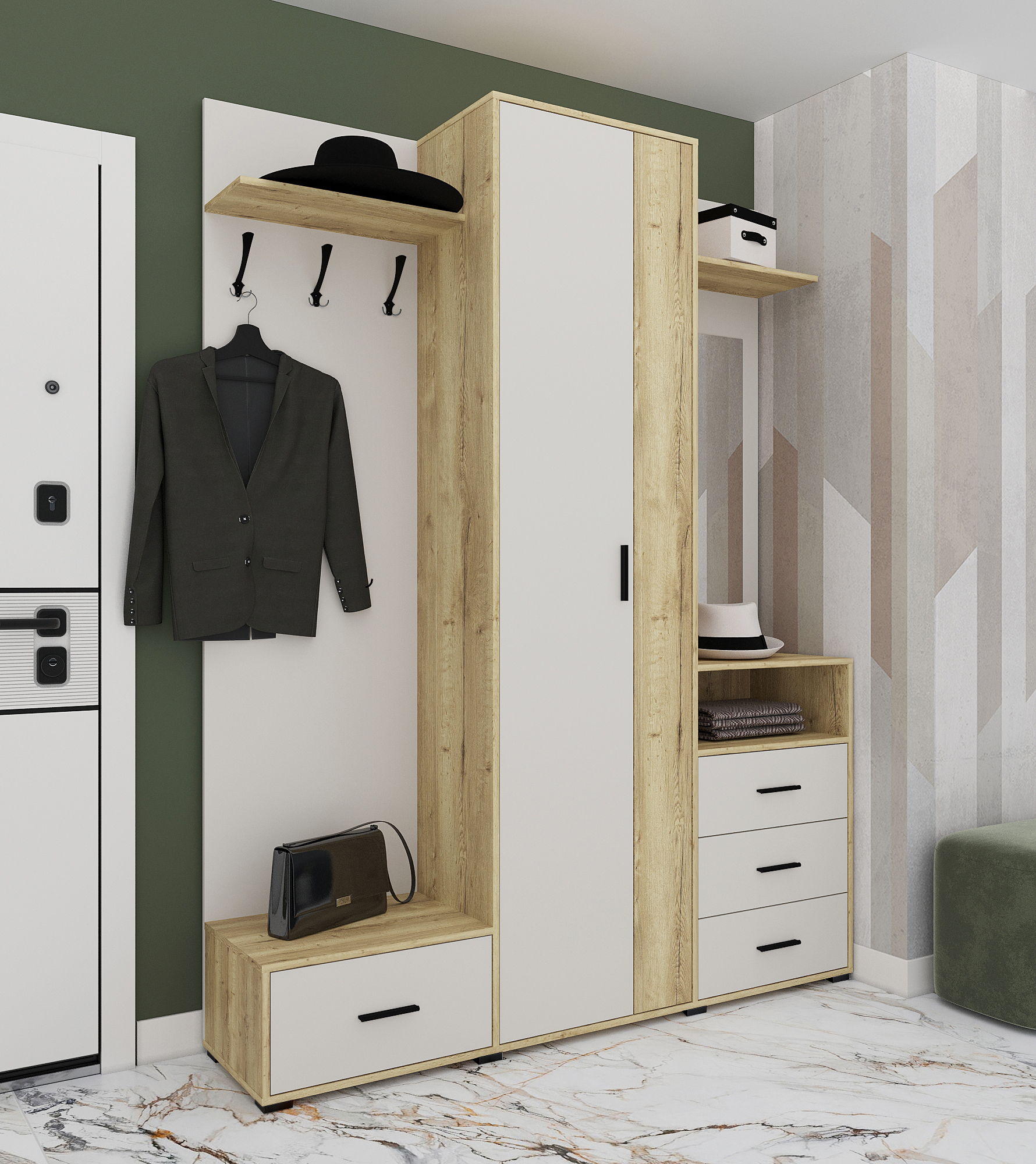 Полноценная прихожая, в которую входит шкаф с выдвижной вешалкой, 4 шуфляды полного выдвижения, зона с крючками для одежды, зеркало, открытые антресоли.