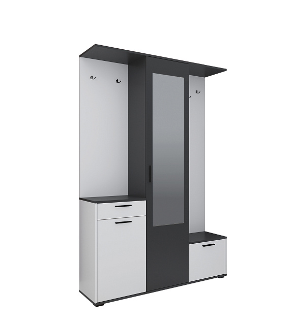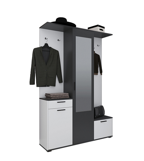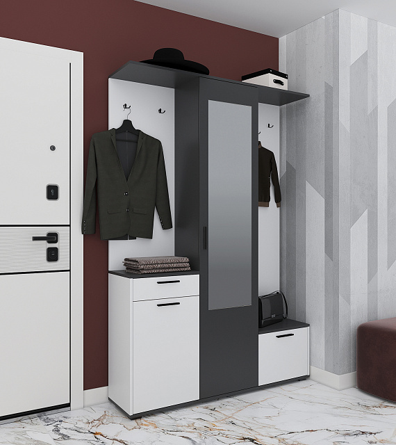 Компактная прихожая, которая включает в себя шкаф с полками и зеркалом, 2 зоны с крючками (для длинной и короткой одежды), тумбу для обуви и высокую тумбу с выдвижной шуфлядой.