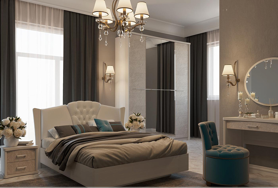 В серии представляем кровати на новой платформе с более жесткой конструкцией. Щит кровати состоит из трех подушек обтянутых микровелюром, центральная часть исполнена в стиле капитоне (каретная стяжка) и лаконичное завершение фрезерованные планки толщиной 32 мм. В кроватях используются бока ЛДСП толщиной 32 мм  и 16 мм,  которые облицованы кромкой ПВХ толщиной 2 мм. Внутренний корпус изготовлен из ЛДСП 16 мм. Размерный ряд кроватей -  1.4х2.0, 1.6х2.0, 1.8х2.0. Кровати изготовлены с подъемным механизмом КРП, внутри бельевой ящик, дно ящика изготовлено из ХДФ и безподъемного механизма КР. В серии представлены 3-х дверные шкафы шириной 1470 мм и 4-х дверные шкафы шириной 1928 мм, 3-х дверные шкафы можно собрать как на левую, так и на правую сторону, в зависимости от расположения полок. Высота шкафов составляет 2330 мм, а полезная глубина 568 мм. Шкафы изготовлены из материала ЛДСП 16 мм, задняя стенка из ХДФ. Фасады представлены в двух вариантах -  створки из ЛДСП 16 мм, в комбинированном варианте  створки из МДФ 16 мм под пленкой ПВХ Бетон бежевый или Антик медь.Центральные створки представлены взеркальном исполнении. В комодах, прикроватных тумбах и туалетном столике выдвижные ящики укомплектованы направляющими полного выдвижения. Дно ящика и задняя стенка выполнены из ХДФ и вставляются в паз. Крышки выполнены из ЛДСП 32 мм с изогнутыми линиями по 3-м сторонам и облицованы кромкой ПВХ толщиной 2 мм. Зеркало в овальной форме, для туалетного столика комплектуется отдельно.