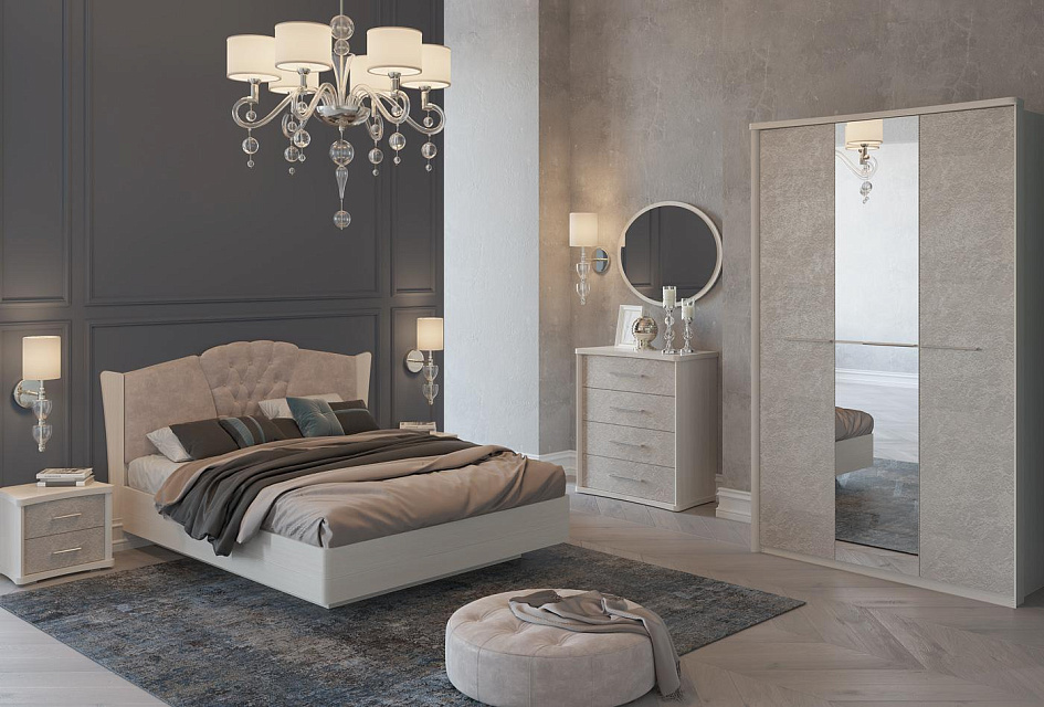 В серии представляем кровати на новой платформе с более жесткой конструкцией. Щит кровати состоит из трех подушек обтянутых микровелюром, центральная часть исполнена в стиле капитоне (каретная стяжка) и лаконичное завершение фрезерованные планки толщиной 32 мм. В кроватях используются бока ЛДСП толщиной 32 мм и 16 мм, которые облицованы кромкой ПВХ толщиной 2 мм. Внутренний корпус изготовлен из ЛДСП 16 мм. Размерный ряд кроватей - 1.4х2.0, 1.6х2.0, 1.8х2.0. Кровати изготовлены с подъемным механизмом КРП, внутри бельевой ящик, дно ящика изготовлено из ХДФ и безподъемного механизма КР. В серии представлены 3-х дверные шкафы шириной 1470 мм и 4-х дверные шкафы шириной 1928 мм, 3-х дверные шкафы можно собрать как на левую, так и на правую сторону, в зависимости от расположения полок. Высота шкафов составляет 2330 мм, а полезная глубина 568 мм. Шкафы изготовлены из материала ЛДСП 16 мм, задняя стенка из ХДФ. Фасады представлены в двух вариантах - створки из ЛДСП 16 мм, в комбинированном варианте створки из МДФ 16 мм под пленкой ПВХ Бетон бежевый или Антик медь.Центральные створки представлены взеркальном исполнении. В комодах, прикроватных тумбах и туалетном столике выдвижные ящики укомплектованы направляющими полного выдвижения. Дно ящика и задняя стенка выполнены из ХДФ и вставляются в паз. Крышки выполнены из ЛДСП 32 мм с изогнутыми линиями по 3-м сторонам и облицованы кромкой ПВХ толщиной 2 мм. Зеркало в овальной форме, для туалетного столика комплектуется отдельно.