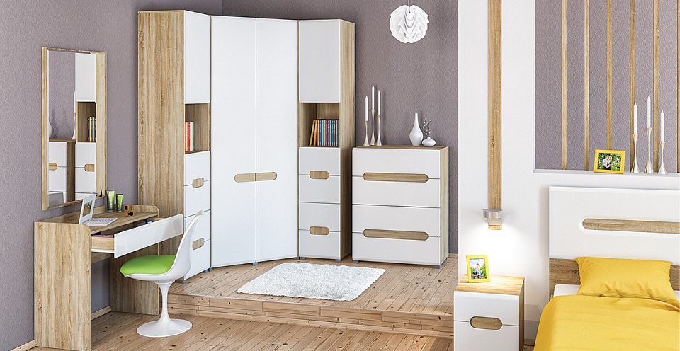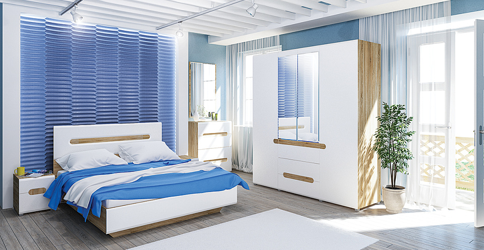 Комплект включает в себя все элементы, необходимые для обстановки спальни – кровать, комод, зеркало, прикроватную тумбу и два вида шкафов для одежды.